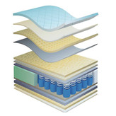 رویه تشک از پارچه تاریپودی پلیاستر ژاکارد با بافت حلقوی ۱۰۰۰ گرمی ساخته شده که ضمن لطافت بالا، جریان هوای عالی و دوام فوقالعادهای دارد. لایههای داخلی شامل الیاف پلیاستر ۱۵۰ گرمی، لایی ترموباند ۸۰ گرمی پلیپروپیلن، اسفنج رول پلییورتان ۱۵ گرمی و اسفنج ۳.۵ سانتیمتری با چگالی ۲۵ کیلویی هستند که نرمی و استحکام ایدهآلی را فراهم میسازند.